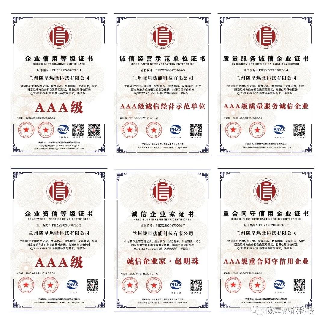 7月7日,北京華普正信國際信用評(píng)價(jià)有限公司和全國企業(yè)誠信公共服務(wù)平臺(tái)結(jié)合國家及地方相關(guān)政策及現(xiàn)狀,按照信用評(píng)價(jià)相關(guān)標(biāo)準(zhǔn),蘭州隴星熱能科技有限公司通過AAA級(jí)企業(yè)信用等級(jí)、AAA級(jí)企業(yè)資信等級(jí)、AAA級(jí)誠信供應(yīng)商、AAA級(jí)重合同守信用企業(yè)、AAA級(jí)誠信經(jīng)營示范單位、AAA級(jí)質(zhì)量服務(wù)誠信企業(yè)的評(píng)級(jí)認(rèn)定,趙明珠總經(jīng)理被評(píng)為誠信企業(yè)家,所有評(píng)價(jià)信息均已在中國招投標(biāo)網(wǎng)和全國企業(yè)誠信公共服務(wù)平臺(tái)進(jìn)行公示。