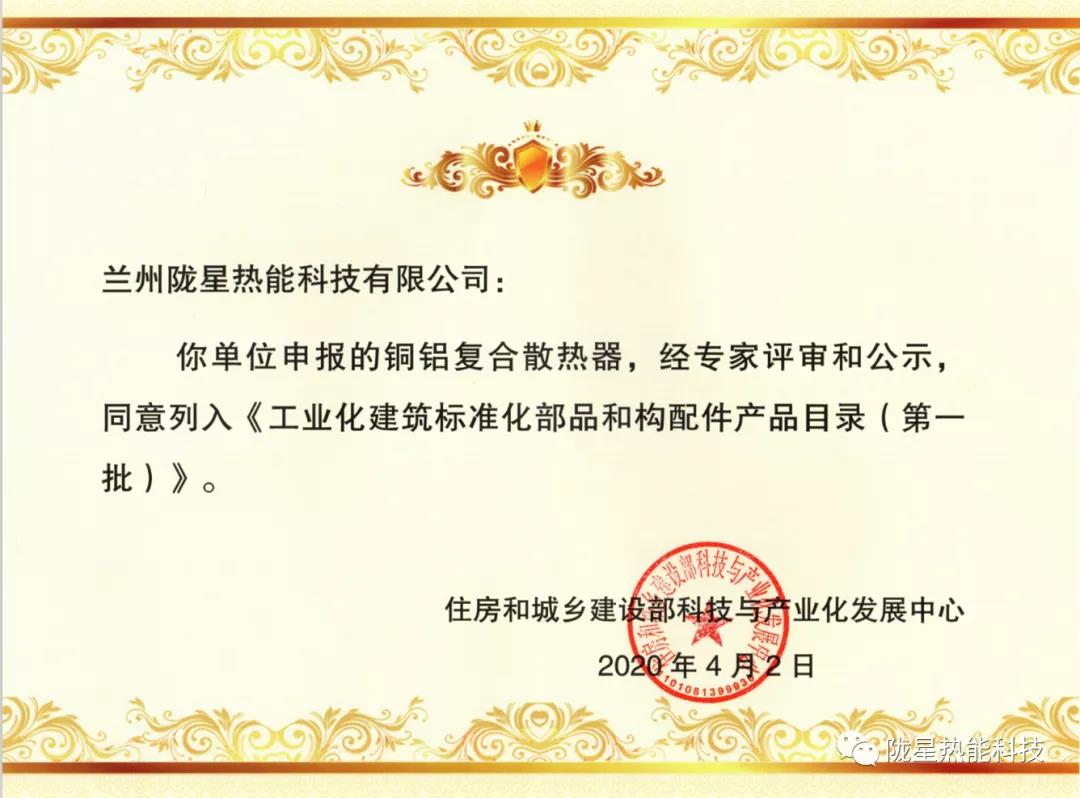 除此之外,隴星7月也是一路乘風(fēng)破浪,載譽(yù)前行。根據(jù)《國務(wù)院辦公廳關(guān)于大力發(fā)展裝配式建筑的指導(dǎo)意見》(國辦發(fā)〔2016〕71 號(hào))文件精神和《工業(yè)化建筑標(biāo)準(zhǔn)化部品和構(gòu)配件應(yīng)用指南》相關(guān)要求。隴星熱能科技公司于今年5月提交有關(guān)申報(bào)材料,經(jīng)住房和城鄉(xiāng)建設(shè)部科技與產(chǎn)業(yè)化發(fā)展中心組織專家評(píng)審,隴星熱能科技公司銅鋁復(fù)合散熱器被列入《工業(yè)化建筑標(biāo)準(zhǔn)化部品和構(gòu)配件產(chǎn)品目錄(第一批)》。